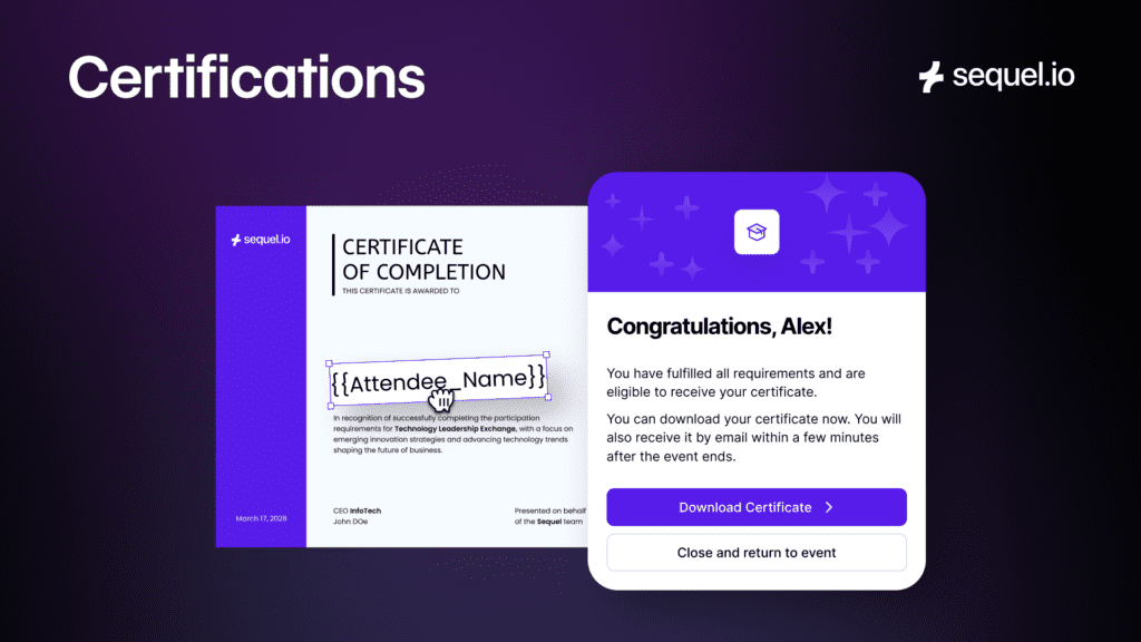 Upload your own PDF template. Sequel dynamically inserts attendee name, event name, and completion date.