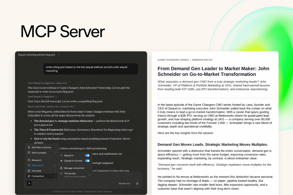 Now, Sequel’s MCP server provides marketing teams with a new way to connect your webinar transcripts directly to the AI tools your team already uses, making your event transcripts accessible inside ChatGPT, Claude, Gemini, Copilot, and any AI that supports the Model Context Protocol.